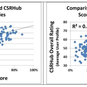 We dug in a bit more to see if we could explain what might be driving these variation at each extreme. A correlation between the Newsweek rating and CSRHub’s four category ratings shows that Newsweek’s score as expected is most closely tied to CSRHub’s environment rating. There is also a connection with CSRHub’s Employee and Governance ratings. However, there is no statistically supported connection with CSRHub’s Community rating, which includes the three subcategories of Product, Community Development & Philanthropy, and Human Rights & Supply Chain.
