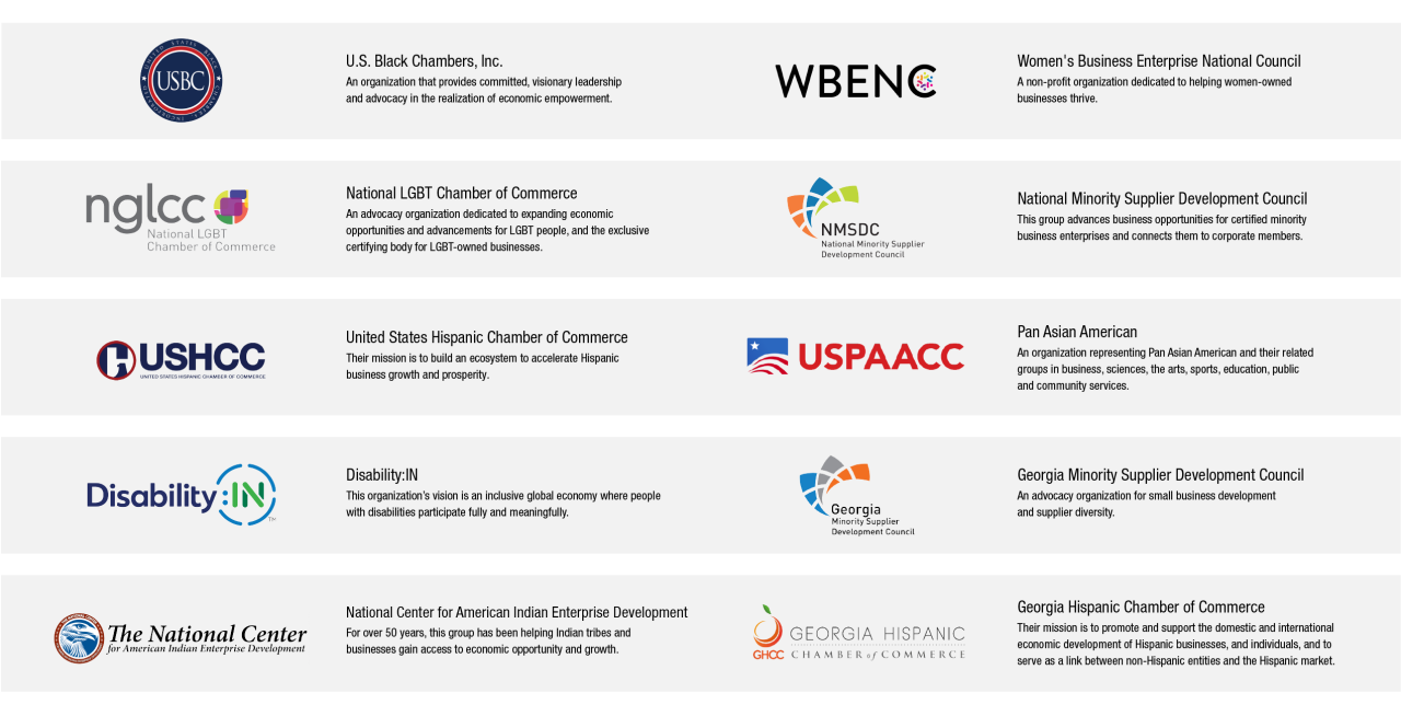 We’ve recently joined five new organizations: U.S. Black Chambers, Inc., National LGBT Chamber of Commerce, United States Hispanic Chamber of Commerce, Disability:IN and National Center for American Indian Enterprise Development.
