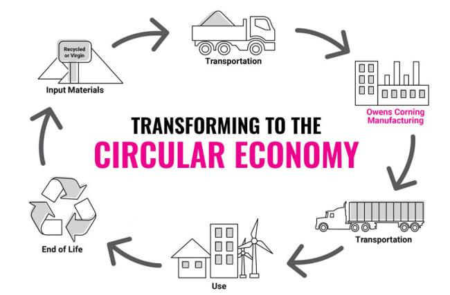 Today, Owens Corning is taking every opportunity to transform our operations to a circular economy model, one in which virgin raw materials, waste, energy and emissions are minimized through intelligent design, renewable and recycled input, energy-efficient production, and enabling the recycling of products at the end of their life cycles.