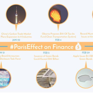 The private sector and state-owned enterprises have begun widespread assessments of their exposure to climate risk, which was reflected in the record number of votes on climate change-related issues at this year’s annual US shareholder meetings. Businesses and governments have also shown an increased willingness to put a price on carbon, as evidenced by President Obama’s proposal for a $10/barrel oil tax and China’s announcement that it will expand its carbon trading market to eight major industries. The finance sector is putting increasing stock into green bonds in the wake of the Paris Agreement. Moody has estimated that the post-Paris green bond market in 2016 could exceed a record-breaking $50 billion. Of that $50 billion, a single company, Apple, issued $1.5 billion in green bonds.