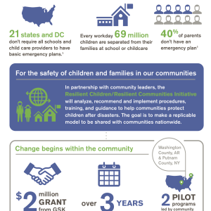 “GSK is committed to supporting the health of communities where we work and live. It is vital that business, academia and non profits work together to protect those who can’t protect themselves, children. We are proud to be a partner in the Resilient Children/Resilient Communities Initiative, and a part of the solution to ensure our communities and families are prepared to face critical emergencies and disasters.” said Jack Bailey, president, US Pharmaceuticals, GSK.