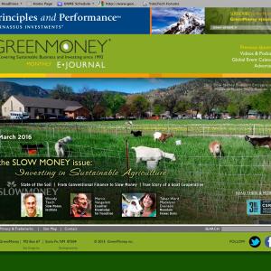 Now, on to this March 2016 issue of GreenMoney on Slow Money where we bring our discussion back down to earth, grounded in the soil where we grow our food and sustain our planet and its many living systems. As we spend our money on a myriad of food products, our dollars can help redirect farming for a more sustainable and healthier world. You’ll read about how people are investing in sustainable agriculture to achieve healthy returns. This issue will help you understand why stewardship of our land and water using sustainable agriculture should not only be part of your shopping and diet, but also a healthy portion of your financial portfolio. Find the new issue at - www.GreenMoney.com