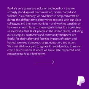 PayPal’s core values are inclusion and equality – and we strongly stand against discrimination, racism, hatred and violence. As a company, we have been in deep conversation during this difficult time, determined to stand with our Black colleagues and their communities – and working together on how we can contribute to meaningful change. It is absolutely unacceptable that Black people in the United States, including our colleagues, customers and community members, are fearful for their safety and face the impacts of racism and hatred. We need dialogue, change, education, and action. We must all do our part to agitate for social justice, so we can create an environment where we are all safe, respected, and can aspire to be our best selves.