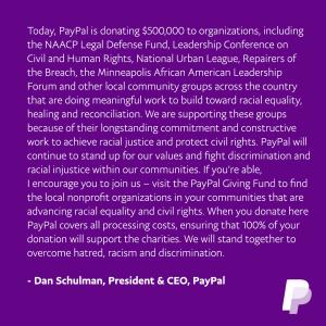 Today, PayPal is donating $500,000 to organizations, including the NAACP Legal Defense Fund, Leadership Conference on Civil and Human Rights, National Urban League, Repairers of the Breach, Minneapolis African American Leadership Forum and other local community groups across the country that are doing meaningful work to build toward racial equality, healing and reconciliation. We are supporting these groups because of their longstanding commitment and constructive work to achieve racial justice and protect civil rights.