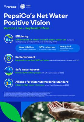 Bold new goals will guide tangible operational action towards PepsiCo's "Net Water Positive" ambition to reduce absolute water use and replenish back into the local watershed more than 100% of the water used at company-owned and third-party sites in high-water-risk areas.