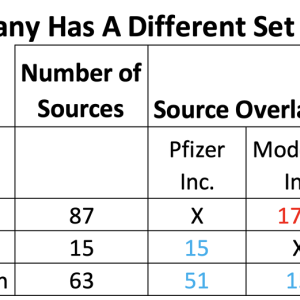 One might expect that three competitors in the same industry would have the same data sources. Our example companies provide a nice illustration that this is not true. It turns out that all 15 of the sources available on Moderna are also available for Pfizer and J&J. However, both Pfizer and J&J have sources that the other one does not.
