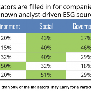 Some may assume that when two companies have the same sources, they will have the same data elements. This is also not true. Many major ESG data sources are more empty at the indicator level than full.