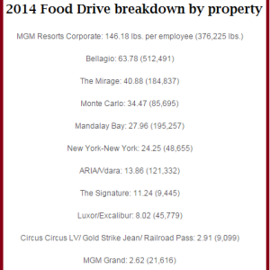 Many resort teams turned in impressive figures. The Mirage, Monte Carlo, ARIA/Vdara, Signature, New York-New York and Luxor/Excalibur all more than doubled their totals from 2013. The collective Companywide effort, 30-plus pounds of donated food per employee, was up from 17 pounds last year. Not surprisingly, the 1.6 million pound total set another record for Three Square.