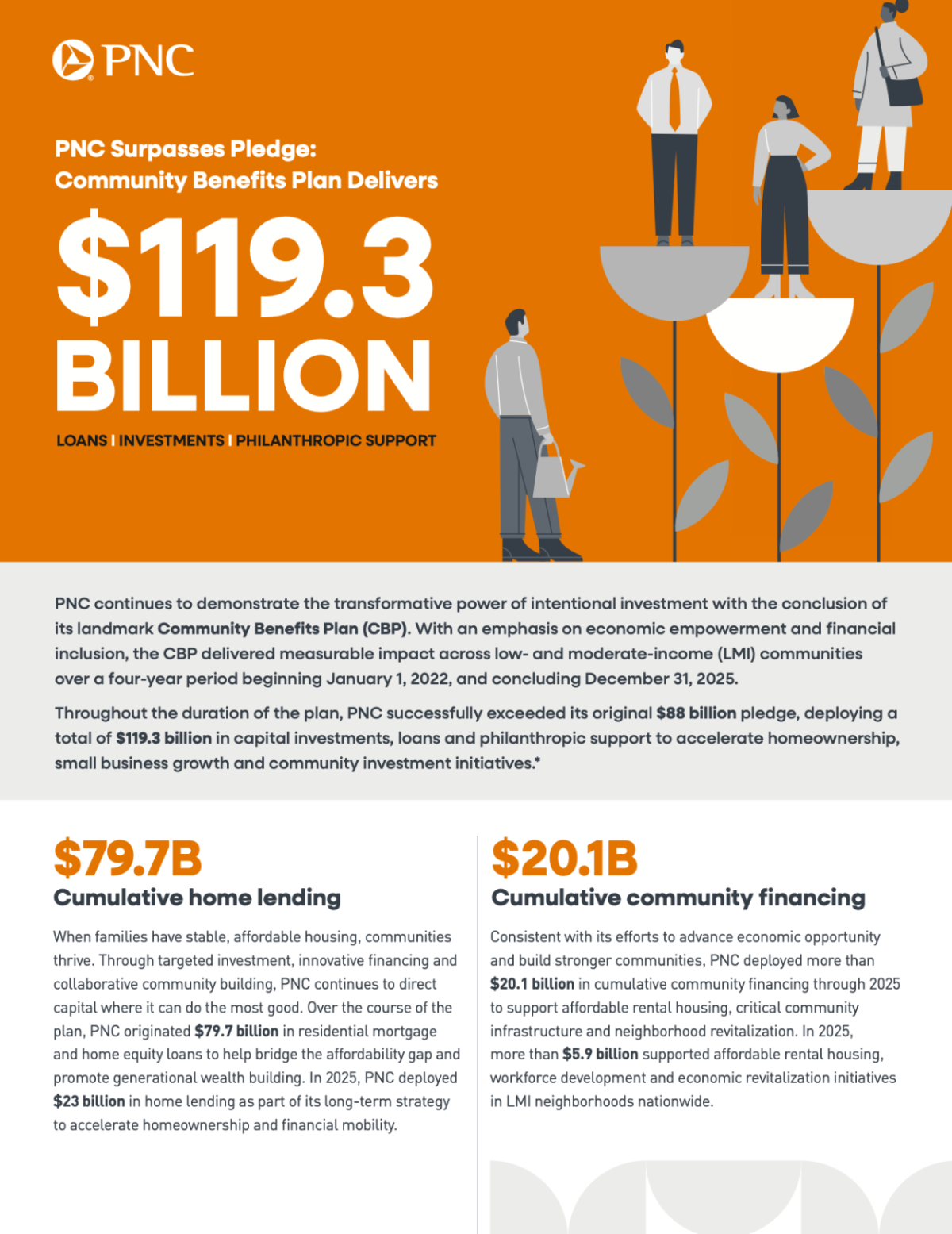 At the close of 2025, PNC marked the successful completion of its ambitious four-year Community Benefits Plan (CBP) launched January 1, 2022, and concluded December 31. Surpassing our original $88 billion commitment with $119.3 billion in capital investments, loans and philanthropic support, PNC expanded homeownership, small business growth and community revitalization initiatives in low- and moderate-income (LMI) communities nationwide.