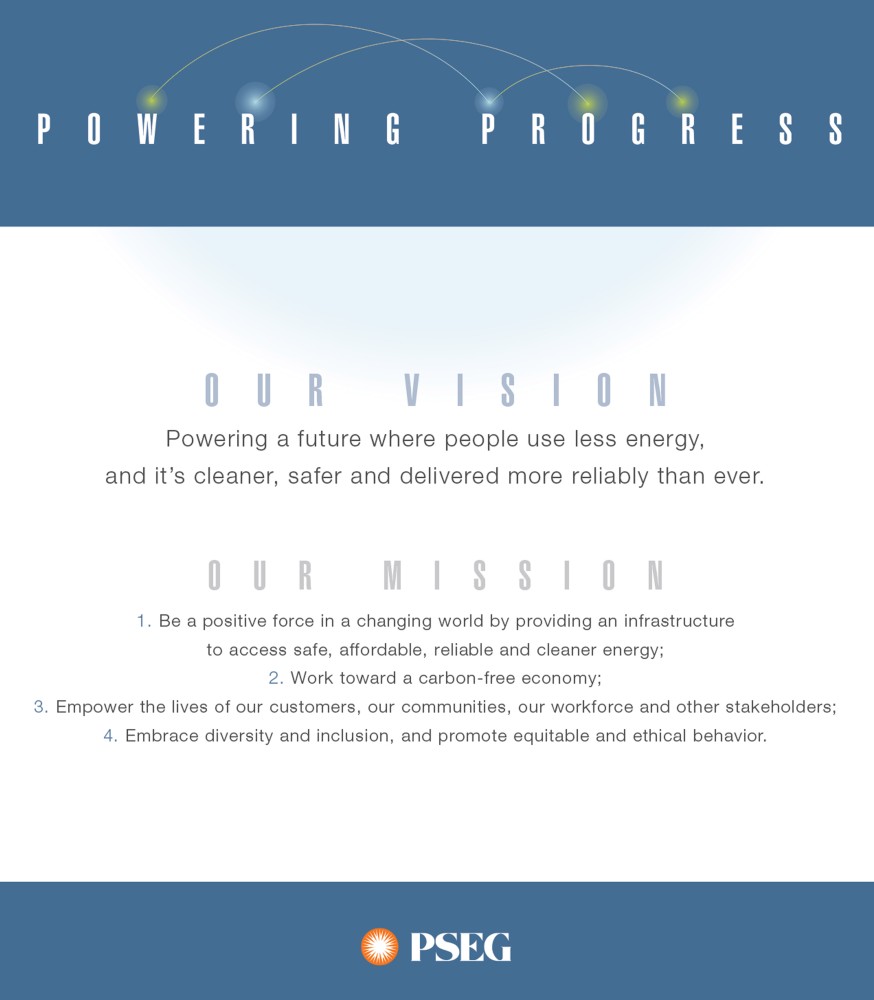 Until now, Powering Progress is how PSEG described the company’s vision to power a future where people use less energy, and it’s cleaner, safer and delivered more reliably than ever. Now, Powering Progress means so much more. It’s also our new mission: to be a positive force in a changing world by providing infrastructure to access safe, affordable, reliable and cleaner energy; to work toward a carbon-free economy; to empower the lives of our customers, our communities, our workforce and other stakeholders; and to embrace diversity and inclusion, and promote equitable and ethical behavior.