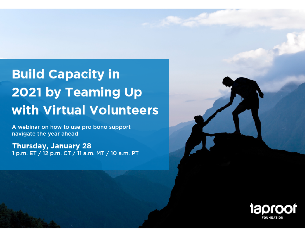 Join Taproot Foundation’s free webinar for nonprofits on Thursday, January 28 at 1 PM ET/10 AM PT for all the tools you’ll need to tap into valuable support from virtual skilled volunteers. During the event, you’ll learn how to plan for, request, and manage a successful pro bono project in high-need areas like communications, design, and HR. Taproot will also dig into how to connect with their online community of more than 75,000 experienced business professionals through their online pro bono platform for social good organizations, public schools, and small businesses.