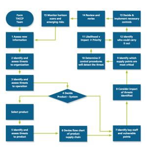 Just as in HACCP, the TACCP team is a multidisciplinary group of people that perform the risk assessment, identify threats, implement controls to eliminate or minimize the threats, develop corrective actions in case the plan fails, and establish verification and record-keeping processes. Once a TACCP team is formed, the TACCP process involves 15 steps.