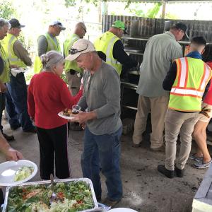 Three days ago, a group of linemen restored power to a family on the hillside that they have come to know well. The family said they must come to lunch today, and so at noon as planned, lots and lots of trucks parked along the narrow road in front of their home. A man handed each lineman a plate, and a scraggly, blind dog and loud, begging cat darted about the makeshift cafeteria on the patio.
