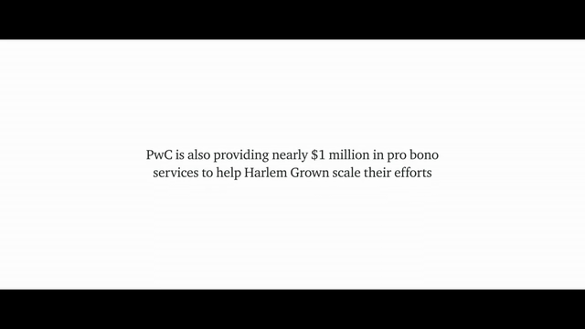 Since 2012, PwC has supported the mission of Harlem Grown with over 1,500 hours of volunteer time teaching financial literacy and healthy habits to children of the Harlem community. PwC is also providing nearly $1 million in pro bono services to help Harlem Grown scale their efforts and reach other communities across the U.S.