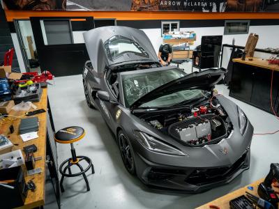 Because of the new mid-engine layout, the C8 Corvette does not feature a flat rear deck like previous models. Arrow engineers faced a design challenge in reconfiguring the SAM electronics between the car’s trunk and “frunk” in a new layout.