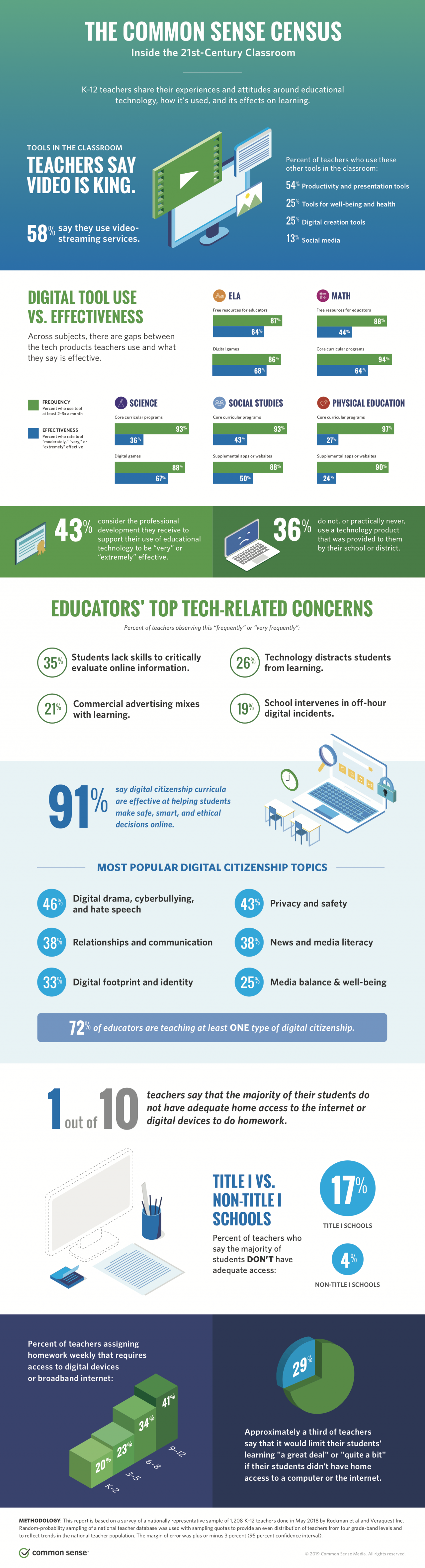 The research looked at digital citizenship, digital tools and their effectiveness for student learning, access to technology for classroom learning, and technology-integration policies. Click here for key census findings and check out this infographic for a quick look at the state of modern classrooms.