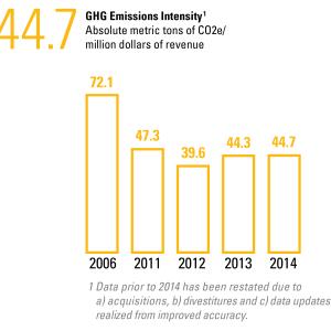 Through 2014, Caterpillar has reduced GHG emissions intensity from our facilities by 38 percent compared to our 2006 base year. Multiple energy management projects have contributed to our success in reducing the greenhouse gas (GHG) emissions of our facilities around the world. Working to achieve our goal of fewer GHG emissions usually leads to ways we can also reduce our energy use and associated costs, with multiple benefits to Caterpillar and the environment.