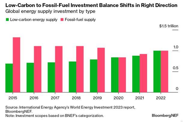 Globally, the energy transition is moving in the right direction. Investment in low-carbon and fossil-fuel energy supply hit parity for the second time ever in 2022, based on BNEF’s aggregation of the International Energy Agency’s World Energy Investment data. That’s up from 0.5-to-1 in 2015, the year the Paris Agreement was signed.