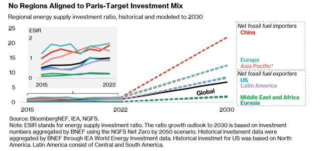 Staying on track for net-zero emissions requires at least $4 dollars to be spent on low-carbon energy supply for every dollar that goes to fossil fuels throughout this decade. But this global picture, derived from BloombergNEF analysis of commonly referenced climate scenarios, masks the regional nuances in the capital expenditure needed to limit global warming to 1.5C.