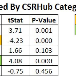 The high “P-Values” and small tStat coefficients for the correlations with Employees and Governance ratings indicates that these company programs are not directly tied to the SPI. This makes sense, as the SPI’s indicators are focused on societal issues such as health, literacy, and longevity, not on how well corporations pay their employees, train them, or how well they govern themselves. Still, it is disappointing that there is not a connection between these elements and the SPI. We would have liked to believe that paying one’s employees well and giving them good benefits would improve overall health and well-being. We would also have liked to see a tie between a high standard of ethics within corporations and strong government programs that care for those who are disadvantaged or poor.