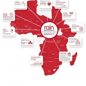 Over the course of the past decade, RAIN has improved access to clean water for communities, schools, and clinics across 41 African countries as well as enhanced access to hygiene and promoted better hygiene behaviors. The program has also enabled the economic empowerment of people by creating opportunities for employment, entrepreneurship, and skills generation. In addition, RAIN has helped to protect critical watersheds, supported several African utilities in coping with the rapidly growing water demand in cities, and delivered essential hygiene items and personal protective equipment to help slow the spread of COVID-19.