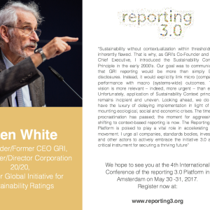 Allen White, Co-Founder of GRI and a Reporting 3.0 Validator, will join us by video-link from Boston to launch the Reporting Blueprint. Have a look at the attached speaker quote to get a sneak peak at some of his thoughts on the current state of reporting and the role Reporting 3.0 plays in mapping the necessary future trajectory of disclosure.