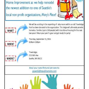 Republic Services of Seattle, WA took time to volunteer their time at Mary’s Place, a resource/housing center for homeless woman and children in the Seattle, WA area. Mary’s Place was in need of remodeling of the rooms of a building, a former Travel Lodge, that was donated to them. The center houses 200 family members at any given time.
