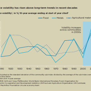 - The energy needs and costs of raw material extraction are becoming more acute. Consequently, price volatility levels for metals, food and non-food agricultural output in the first decade of the 21st century were higher than any single decade in the 20th century.