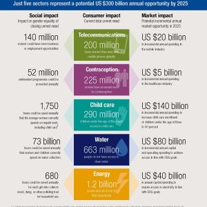 In addition to the moral imperative of closing the gender gap, the potential market impact is likewise substantial, creating significant opportunities for investors. In fact, achieving parity across products and services in just five sectors—water, contraception, telecommunications, energy, and child care—could unlock a market of more than US $300 billion in incremental annual spending by 2025.