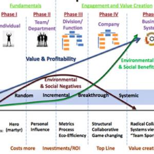 Almost every company I have known to start down a formal path of sustainable business strategy has had the benefit of a passionate advocate for change. Sometime it’s a visionary CEO like Ray Anderson at Interface other times it’s been charismatic internal leaders like Betsy Blaisdell at Timberland or Auden Schendler at Aspen Skiing Company (to name two of many, many friends and colleagues in this category). In fact, there are so many examples that it’s common to associate “green” companies with this style of leadership. Although the charismatic phase is responsible for a lot of progress, in order to move up the matrix and deliver far bigger benefits, sooner or later the personality driven approach has to give way to a process driven program. That shift identifies stage III.