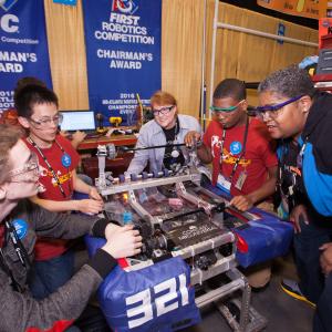 FIRST® (For Inspiration and Recognition of Science and Technology) is a premier STEM education organization that provides team-based robotics competitions for students from elementary school through high school. Through FIRST Robotics Competition, high school students work in teams, designing and building their own robots to compete against – as well as work with – other teams from all over the world. Each year, a new game challenges them to overcome obstacles and perform various difficult tasks. In April, after a series of matches, the winning teams meet at the Championship, held this year in St. Louis’ Dome at America’s Center.