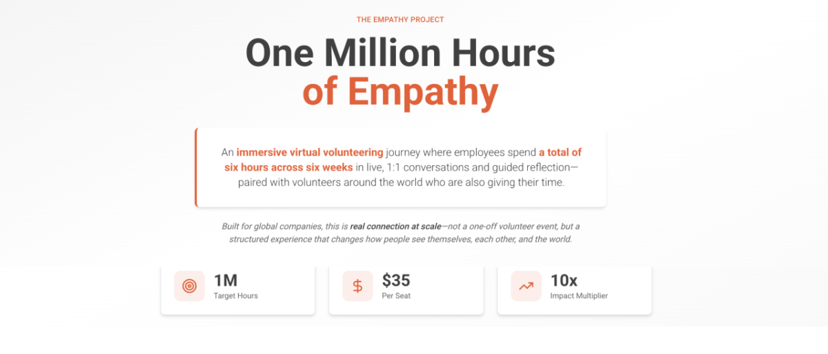 Six-week program connects corporate employees with international conversation partners through technology-enabled human dialogue, aiming for 1 million hours of "empathy work" by end of 2026