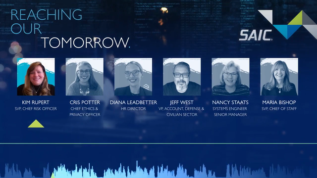 In the third edition of our podcast series, Kim Rupert, SAIC senior vice president and chief risk officer, leads the discussion on integrity with her colleagues, Cris Potter, Diana Leadbetter, Jeff West, Nancy Staats and Maria Bishop. Watch to learn more about how we foster a culture of integrity at SAIC.