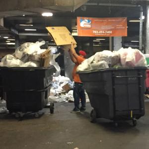 Within The Palazzo recycling dock which services both properties and sorts every single trash bag that comes through the property, there are always at least 12 people working, sorting garbage and recyclable items. The machines automatically press plastic, boxes, and glass to be taken to the city recycling plant.