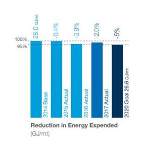 Our goal is to reduce the total amount of energy expended per ton of product by 5 percent, as compared to the 2014 baseline. In 2017 we achieved a 2 percent reduction and are on track to reach this goal.