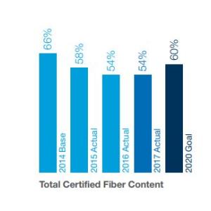 Our 2014 base year achievement of 66 percent certified fiber reflects the mix impact of high levels of certified kraft pulp purchased for the Cloquet site after conversion of the pulp mill to make dissolving wood pulp (as well as kraft). Since then, as we swung to making more kraft pulp at Cloquet, certifi ed levels dropped. The current level of certifi ed fi ber of 54 percent also refl ects somewhat limited certifi ed wood located in economic hauling range to our two pulp mills.