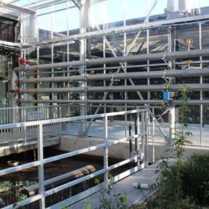 The process design includes plants suspended over treatment tanks enclosed in a greenhouse. The plant roots enhance the biological treatment process, making it more efficient, reducing energy and space requirements. The greenhouse also helps meet the aesthetic objectives for building the facility in a residential area, as well as controlling fugitive odors and noise. The completed plant meets the community’s 1 odor unit criteria (i.e. no detectible odors with a sample diluted 1 time) and complies with the community’s existing noise bylaws (under 55 dBa, a measure of the relative loudness of sound, in daytime and 45 dBa at night), even when standby generators are operating. Although the plant was created with a small footprint, the plans allow for future expansion.