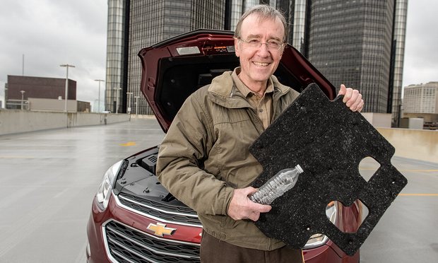 Water bottles from five GM facilities in Michigan get a second life as fleece-like material used in the Chevrolet Equinox. Seven bottles are needed to make enough fabric insulation to soften the noise of the crossover’s V6 engine.
