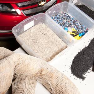 GM continues to shred and use its test tires and packaging plastic in the manufacturing of air and water baffles for a variety of vehicles.