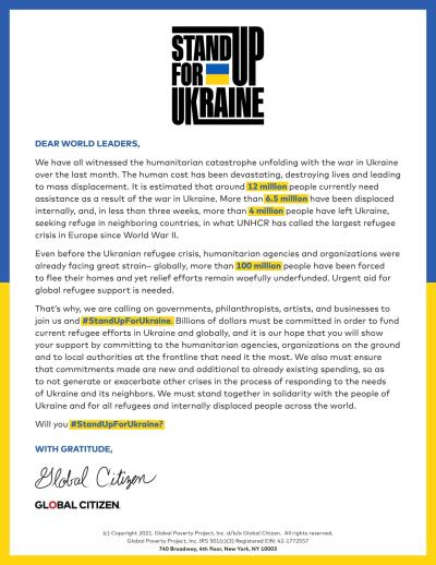 As part of the Stand Up for Ukraine campaign, Global Citizen and 77 organizations, businesses, and institutions published an open letter to world leaders on Friday, calling for governments, philanthropists, artists, and businesses to support humanitarian relief efforts for refugees from Ukraine and conflicts around the world.