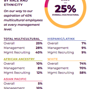 We’ve declared two representation aspirations: globally to achieve gender-equal representation at every level, and in the U.S. to achieve 40% representation of multicultural employees at every management level of the Company. We are publishing progress on increasing diversity in our workforce at pg.com/ equalityandinclusion.