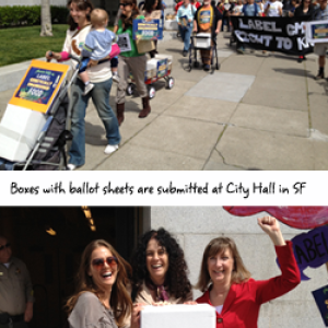 We have very exciting news! On May 2nd, the 2012 California Right to Know Campaign submitted a total of 971,126 signatures in support of GMO labeling in counties all across California, nearly double the number of signatures necessary to qualify for the November ballot. Rallies were held at City Hall in San Francisco and in three other cities, where boxes full of ballot sheets were ceremonially submitted. Helen Lentze, Denise Shermer and Albert Straus were able to attend the festivities in San Franicsco and Albert spoke to show his support at the press conference. Watch the full speech here.