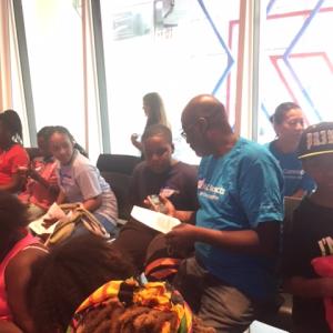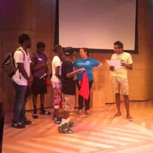 In a three-week program this summer, forty public school students from Manhattan and Brooklyn learned about the science, technology, engineering, and math (STEM) principles behind producing and airing radio journalism, while also fine tuning their interviewing, writing, and critical thinking skills. On July 21st, groups of students put their new skills to work, as they teamed up with TWC employees, across marketing, technical operations, sales, and customer care departments, and hit the streets on a sound-bite scavenger hunt. The Radio Rookies were tasked with finding and interviewing New Yorkers who had met President Obama, gone skydiving, written books, and more (a.k.a. vox pop—interviewing the public). But before heading out, the students heard from Sean Rameswaram, a NYPR Studio 360 producer, who introduced the group to podcasts. After sharing an example from his own podcast, sideshow, he played an audio reel of the students’ own work from the previous day’s workshop.