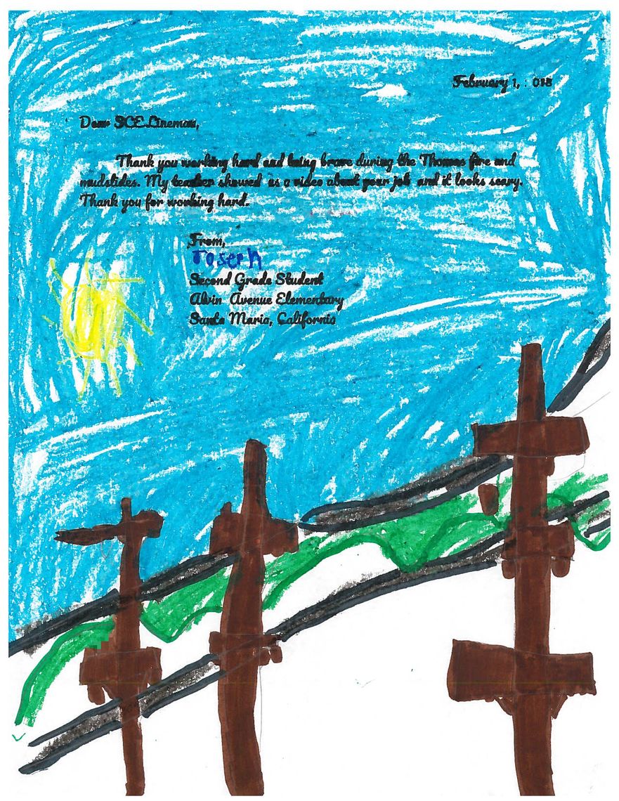 “Thank you for working hard and being brave during the Thomas Fire and mudslides. My teacher showed us a video about your job and it looks cool. Thank you for fixing the wires,” wrote second-grader Joseph.
