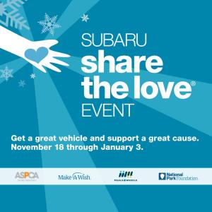 The Largest Impact – The Subaru Share the Love Event is now in its 14th year, and we are the largest automotive donor to Make-A-Wish and Meals on Wheels, and the largest corporate donor to the ASPCA and the National Park Foundation. By the end of this year, we’ll have donated more than $225 million to charity. During the Subaru Share the Love Event, Subaru will donate $250 to the charity of your choice when you purchase a new Subaru.