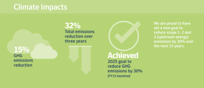 During fiscal year 2018, we signed on to participate in the Science Based Targets initiative (SBTi). Because we met our 10-year goal earlier than anticipated, we are now working on a new scope 1 and 2 GHG emissions reduction goal, as well as our first scope 3 goal, in line with the SBTi criteria. Read more about the SBTi here.