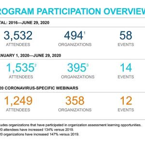 Webinars have focused on helping organizations manage through emergencies, covering topics from financial leadership in times of crisis to mental health care for frontline workers. Most participants said they are likely to apply learnings from the webinars to their work and that the content presented was very helpful.