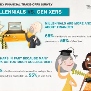 - Millennials are more anxious about finances than Gen Xers: 68% of millennials (respondents between ages 21 and 34) report being overwhelmed by financial pressures compared with 58% Gen Xers (respondents between ages 35 and 50).