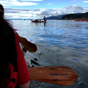 A wave broke inside of me. In those moments, I wasn’t even aware that I was still pulling, still locked into the rhythm and steady slide of our yaakw. When I became conscious of the world around me, my face, neck, and collar were soaked, though there was no rain. It was as if what was inside had been pulled out, the way salt lances a wound. The profound healing from this journey is still one I am learning from today. It has made me so grateful and much more prepared to serve our peoples.