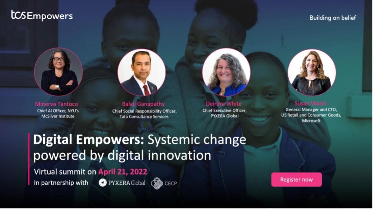 Over the course of the next year, participants will have the opportunity to engage with others focused on systemic change powered by digital innovation leveraging cross-sector collaborations, purpose coalitions, and partnerships to drive sustainable action Digital Empowers’ inaugural event will take place on Thursday, April 21, 1:00 – 2:00 PM E.T. Titled “Systemic Change Powered by Digital Innovation”, the event will feature Balaji Ganapathy; Global Social Responsibility Officer, TCS; Minerva Tantoco, Chief AI Officer, NYU McSilver Institute; Deirdre White, CEO, PYXERA Global; and Susan Walsh, CTO, US Retail and Consumer Goods, Microsoft.